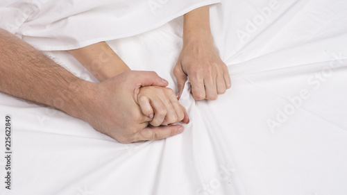 Sensual beautiful young couple is having sex on bed. Female hand pulling white sheets in ecstasy, orgasm. Love concept. Wellness. Couple in love. Orgasm concept