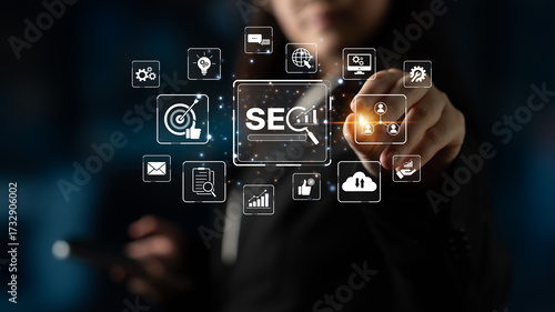 SEO concept for improving SEO visibility, with SEO related digital tools and SEO performance icons shown in an focused layout for strategic marketing. Spline