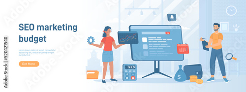 SEO marketing budget. Calculation of costs for website promotion. Digital marketing investment. Flat concept great for social media promotional material. Website banner on white background.