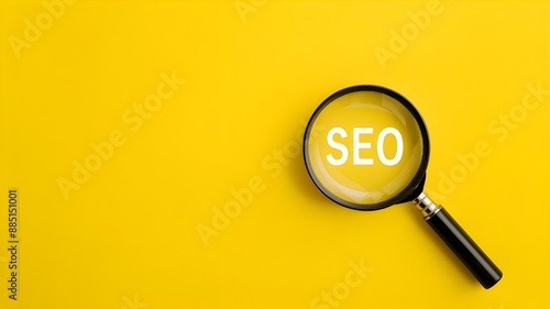 SEO, Search Engine Optimization text, and a magnifying glass on a bright yellow background.Optimization Scheme
