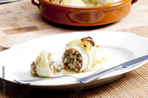 sepia filled with pearl barley baked with onion