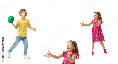 Sequential collage of a joyful caucasian boy in a yellow shirt and girl in a pink dress playing catch with a green ball on a transparent studio background with copy space, active childhood friendship