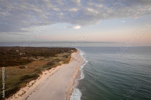 Serene aerial view of a sandy beach and ocean at sunset. Martha's Vineyard