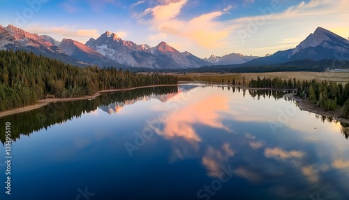 serene aerial view of mirrored valleys and mountains reflecting in calm water with ample space for text or overlays