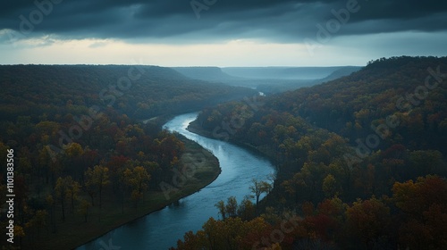 Serene Aerial View of Winding River Surrounded by Autumn Foliage and Dramatic Clouds Overhead in a Picturesque Natural Landscape