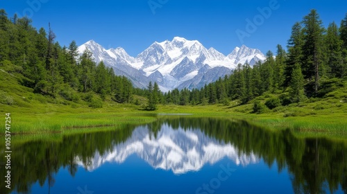 Serene alpine lake reflecting towering snow-covered mountains, surrounded by evergreen trees, capturing the beauty of nature for International Mountain Day