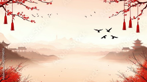 Serene Asian Landscape with Blossoming Branches and Pagoda