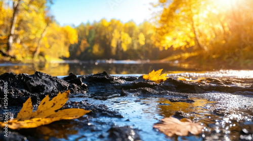 serene autumn landscape featuring colorful leaves by tranquil river, showcasing nature beauty
