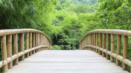 serene bamboo bridge leads through lush greenery, inviting exploration and tranquility