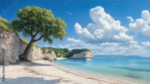 Serene beach scene with lush tree, soft sand, and clear blue water under bright sky
