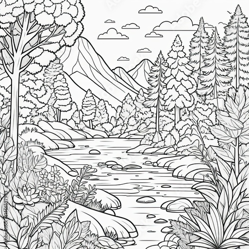 Serene Black And White Mountain River Landscape Illustration