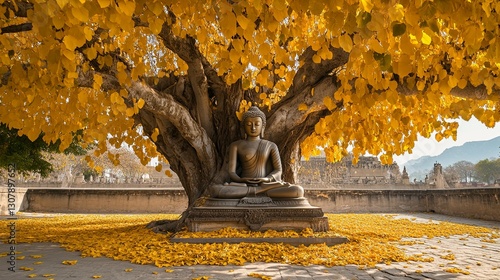 Serene Buddha Statue Beneath Golden Autumn Leaves