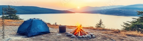 Serene Camping Scene with Tent and Campfire at Sunrise by Calm Lake Surrounded by Lush Mountains and Reflection in Still Water