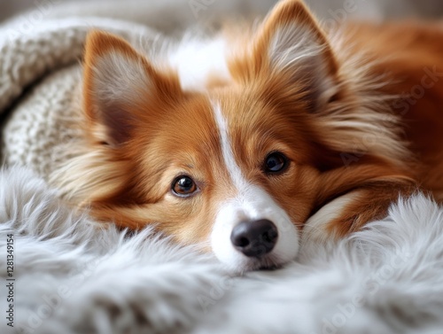 Serene canine portrait of a border collie resting on a fluffy white blanket in soft light