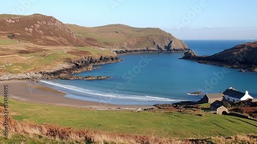 Serene coastal cove with sandy beach, nestled between rolling green hills and clear blue waters. A small dwelling sits peacefully near the shore