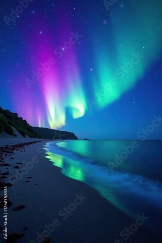 Serene Coastal Scene Illuminated by a Vibrant Aurora Borealis Display