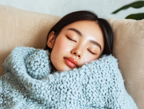 Serene Cozy Napping Moment Young Asian Woman on Beige Couch with Soft Blue Blanket - Modern Workplace Wellness and Relaxation Content for Stress Relief