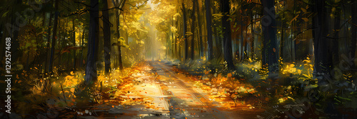 Serene Forest Path at Sunset Painting: Rough Brush Textured Artwork Depicting Tranquil Evening in Nature