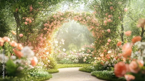 Serene garden wedding scene with a floral arch, plants, and bouquets, creating a romantic, nature-inspired background.