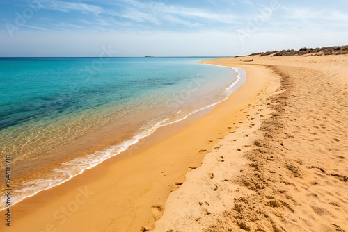 Serene golden sandy beach with turquoise water and footprints under a sunny sky