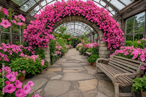 Serene Greenhouse Pathway Archway Pink Flowers Stone Bench