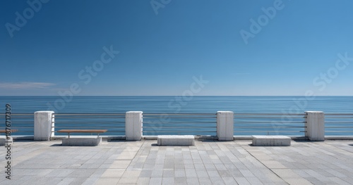 Serene Harbor Pier with Clean Railings and Clear Blue Sea Under Bright Sky