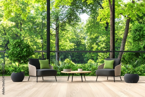 Serene interior with armchairs and lush green forest view creating tranquil relaxing atmosphere for contemplation and peace in contemporary design