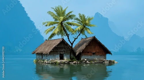 Serene Island Getaway Tropical Houses Palm Trees Calm Ocean Mountain View