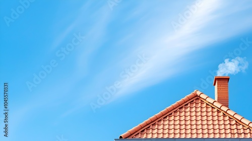 Serene Jet Contrails Against Minimalistic Sky Over Roof - Evoking Travel Dreams and High Altitude Adventures in Tranquil Environments