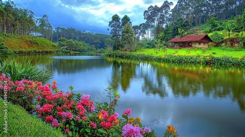 Serene lake house in lush green valley; tranquil scene