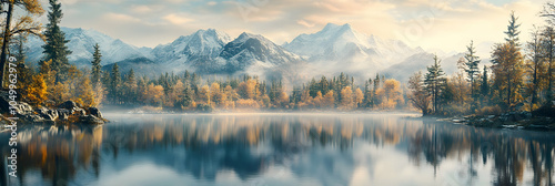 Serene lake with mountain reflection, autumn foliage, tranquil misty landscape