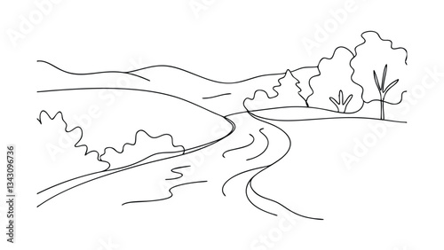 Serene Landscape Drawing Winding River, Rolling Hills, Lush Trees