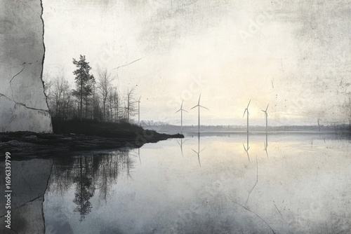 Serene landscape reflecting wind turbines on calm water, artistic grunge texture.