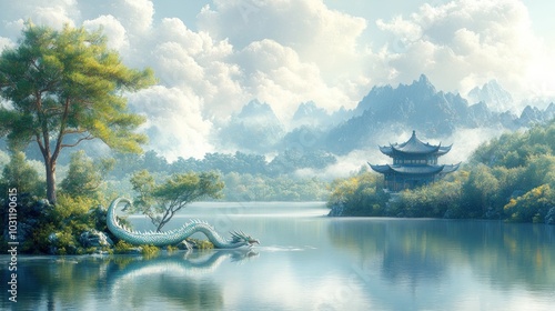Serene landscape with a dragon, lake, mountains, and traditional pavilion.
