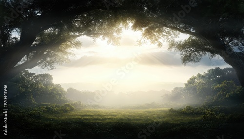 Serene landscape with sun rays filtering through trees, creating a mystical atmosphere in a peaceful forest setting.