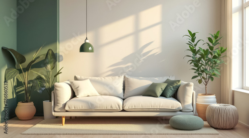 serene living room with a beige sofa green accents