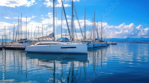 Serene marina with luxury yachts under a bright blue sky, reflecting in calm waters.