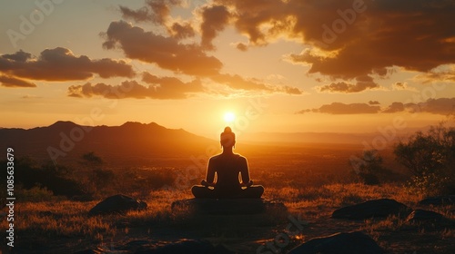 Serene Meditation in Nature: A Silhouette of a Buddha Figure at Sunset Over Mountains, Encouraging Peaceful Reflection and Spiritual Connection Amidst Natural Beauty