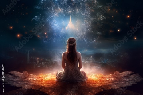Serene meditation under a celestial canopy, in fractal embrace, Generative AI