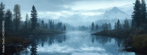 Serene Misty Mountain Lake with Coniferous Forest Reflection Tranquil Nature Scene
