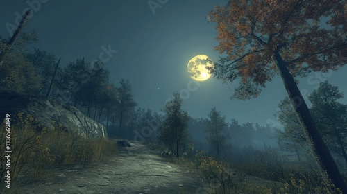 Serene Moonlit Pathway Through Autumn Forest at Nighttime