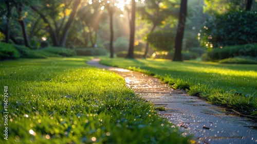 Serene Morning Stroll: Dew-Kissed Path Through Lush Green Park
