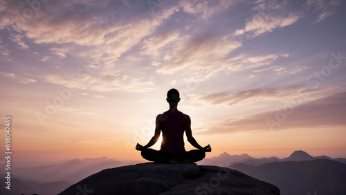 Serene Mountain Yoga Meditation: Woman's Silhouette at Peaceful Sunset