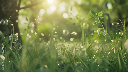 Serene Nature Scene with Dewy Grass, Soft Light, and Floating Bubbles Capturing the Beauty of a Tranquil Forest Environment in a Fresh Spring Morning