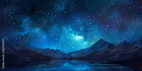 Serene Night Landscape Featuring Star-Filled Sky Vibrant Blue Hues and Mountains Reflecting on Calm Lake