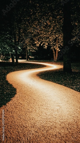 Serene Night Pathway Illuminated by Soft Lights Through Lush Trees in a Peaceful Park Setting