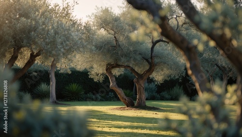 Serene Olive Tree Garden Landscape Bathed in Soft Natural Light