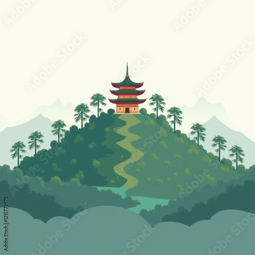 Serene Pagoda Hilltop Landscape - Minimalist illustration