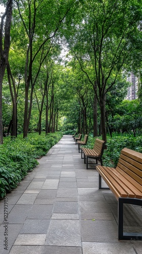 Serene Park Pathway: A Tranquil Walkway Lined with Lush Greenery and Inviting Benches