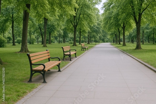 Serene Park Pathway with Empty Benches Surrounded by Lush Green Trees on a Sunny Day